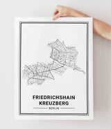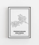 Städtekarte von Berlin Friedrichshain Kreuzberg als wunderschöne Illustration, gedruckt auf hochwertigem Premium-Papier. Verfügbar in verschiedenen Größen.