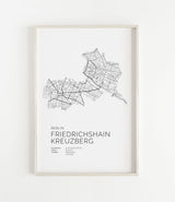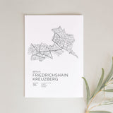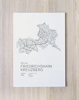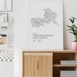 Städtekarte von Berlin Friedrichshain Kreuzberg als wunderschöne Illustration, gedruckt auf hochwertigem Premium-Papier. Verfügbar in verschiedenen Größen.